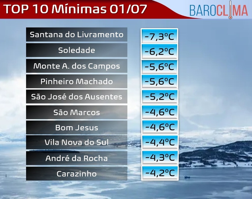 - Sábado (5) - mínima de 7°C e máxima de 12°C
