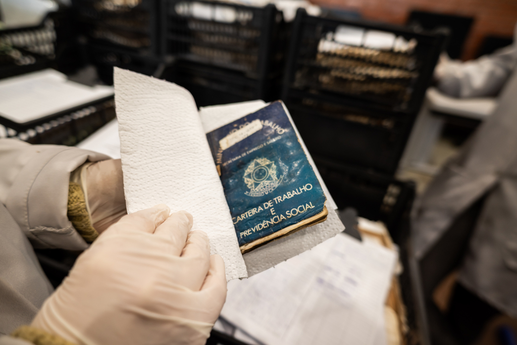 Em meio aos documentos resgatados, uma carteira de trabalho faz com que as arquivistas ressaltem o impacto direto na população. Nesse caso, como a garantia de direitos.
