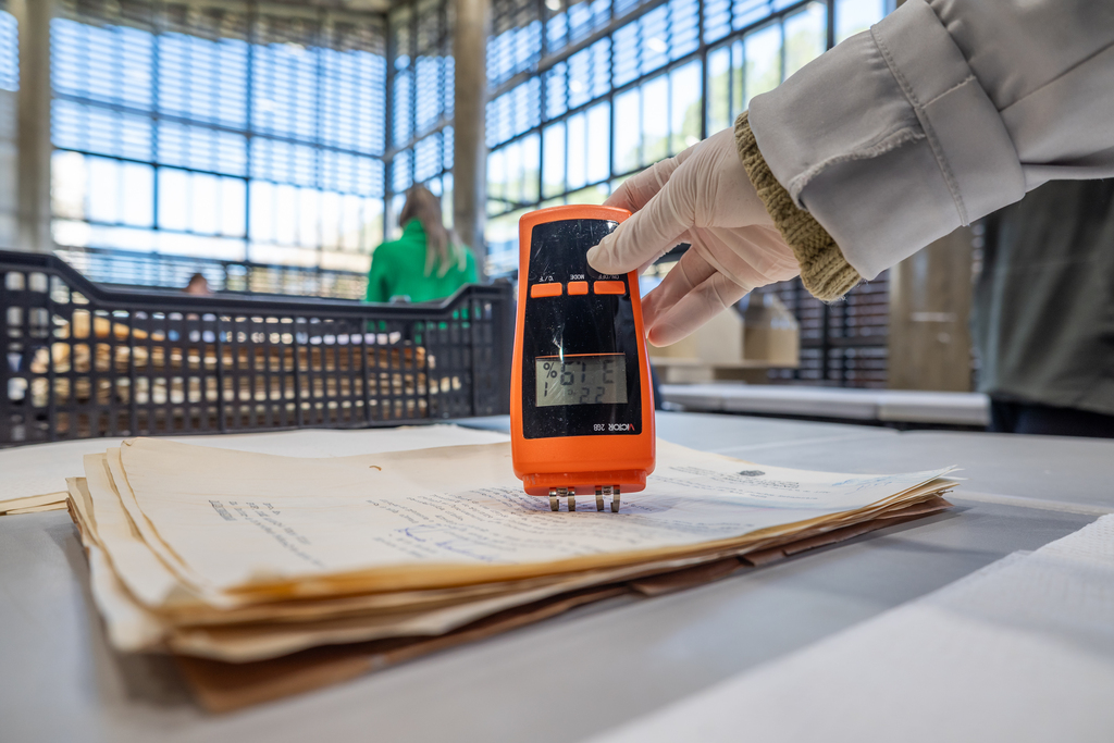 Nessa etapa, é preciso que o documento esteja seco. Para isso, um equipamento, que funciona como uma espécie de termômetro, aponta a temperatura. O ideal é uma umidade menor do que 12%.