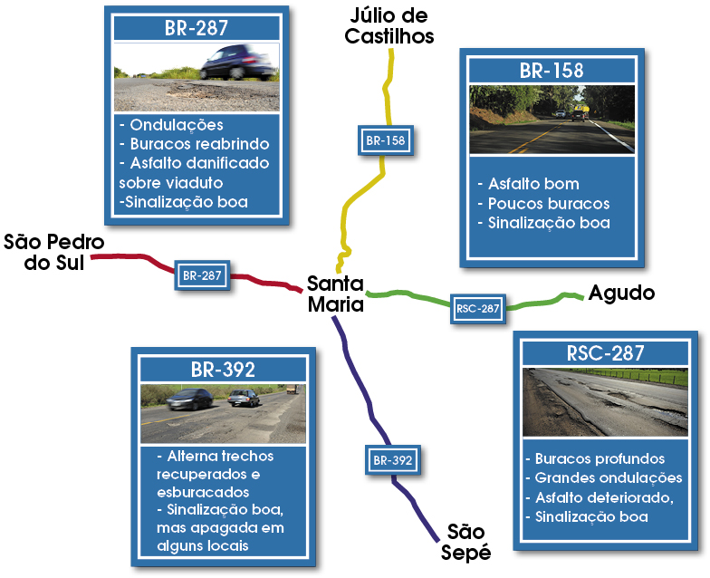 Os longos períodos de chuvas das últimas semanas causaram danos no asfalto, reabriram buracos que haviam sido tapados e desgastaram a sinalização em três rodovias duas federais e uma estadual que ligam Santa Maria aos quatro cantos do Estado. O "Diário" percorreu 50 quilômetros em cada um dos quatro sentidos para ver o que enfrentam pelo caminho os motoristas que trafegam pela Região Central (veja quadro).