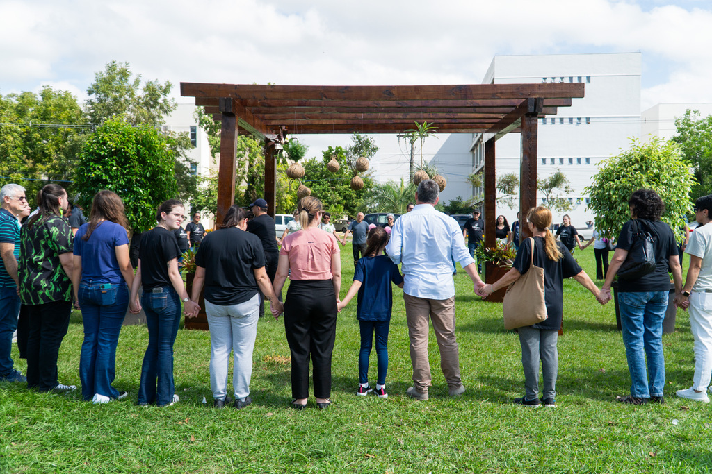 No final da cerimônia, as famílias deram as mãos ao redor do pergolado ornamentado. Alguns falaram brevemente. Em seguida, uma salva de palmas. A estrutura ficará no local por tempo indeterminado. Flores podem ser deixadas no local.
