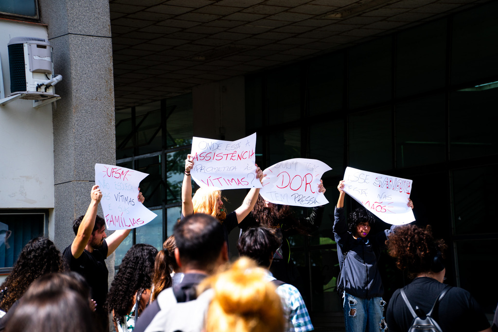Após inúmeros abraços e palavras de confronto, alunos do técnico em Paisagismo se direcionaram ao Restaurante Universitário I com cartazes e apitos. Após convocar mais estudantes, foram em manifestação até o prédio da Reitoria. A aluna do 4º semestre do curso, Eloiza Peronio, 23 anos, explica que o objetivo é cobrar da instituição melhor atendimento médico aos sobreviventes.
