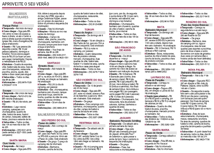 A estação mais quente do ano chega nesse domingo e traz com ela os feriados de final do ano e as férias. E nada melhor para aproveitar o verão do que sombra e água fresca, coisas que você certamente encontra em um bom balneário. Na região, em pelo menos seis, a temporada já começou. Mas a maioria deixou a abertura oficial para o fim de semana, quando começa a Operação Golfinho.