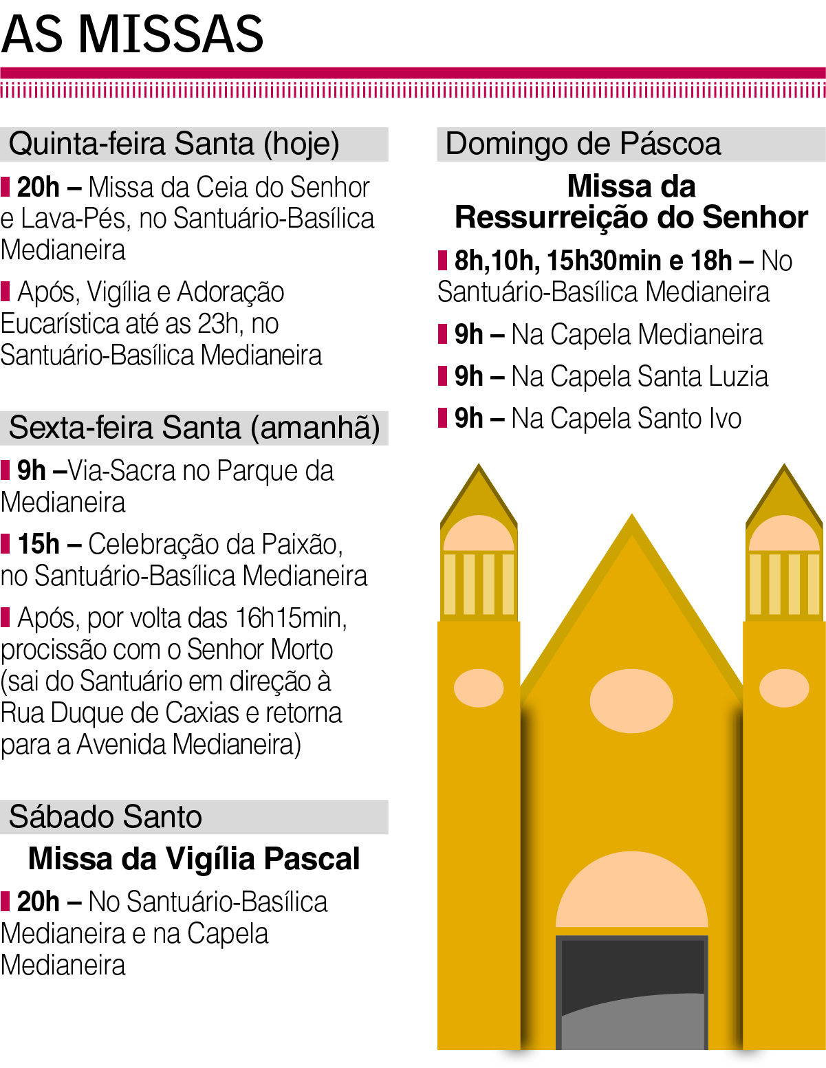 A partir de hoje, os fiéis poderão acompanhar missas e celebrações referentes aos momentos vividos por Cristo. Hoje, entre as atividades previstas (veja quadro abaixo), estão a Missa da Ceia do Senhor e a tradicional cerimônia do Lava-Pés. Amanhã, ocorrerá, no Parque da Medianeira, a Via-Sacra, que recorda o caminho de dor de Cristo. Já à tarde, será realizada a procissão com o Senhor Morto, pela Avenida Medianeira e Rua Duque de Caxias. Haverá, ainda, missas no sábado e, também, no Domingo de Páscoa.
