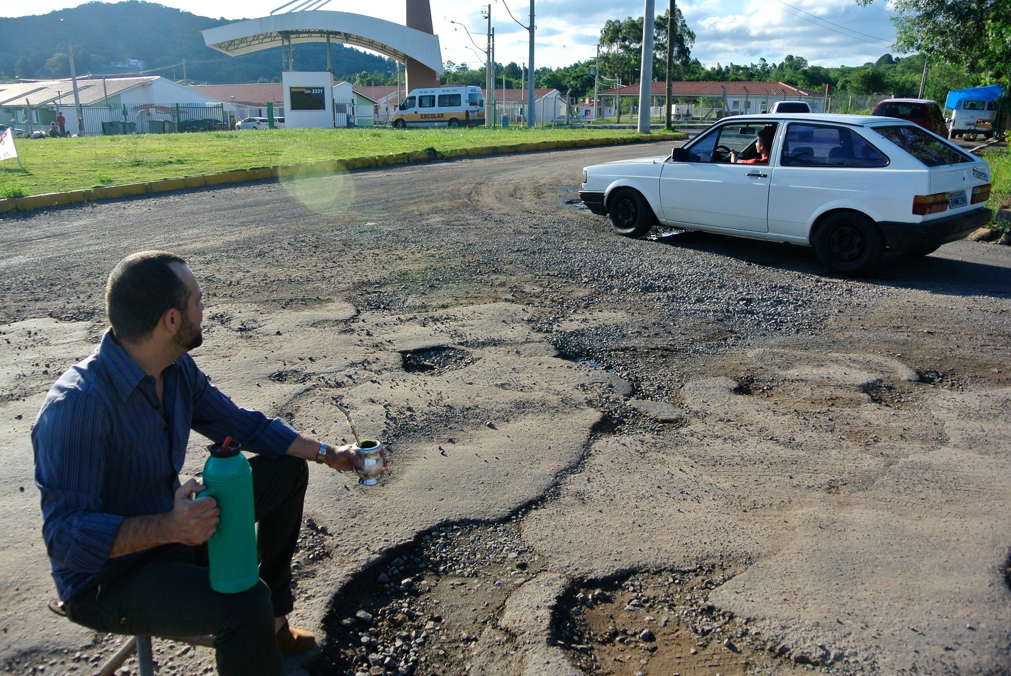 Moradores do bairro Cerrito de Santa Maria organizaram um protesto bem humorado. Por meio do Facebook, criaram o evento Mateada nos Buracos da Rua Pedro Santini.
