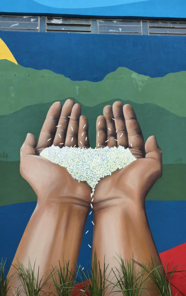 As cores frias, como o uso do azul e verde, são o fundo para imagens que representam o município e região. O artista diz que se inspirou nas características marcantes, como as plantações de arroz, tida como principal cultivo. Além dela, as inúmeras famílias que fazem a cultura seguir de geração a geração também estão representadas. A cultura italiana é predominante.