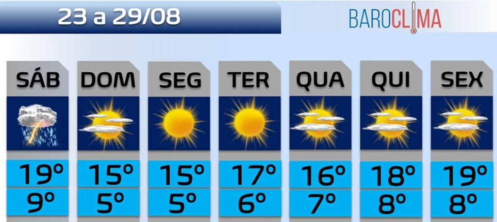 O sábado (23) será marcado por instabilidade persistente, com chuva ao longo de praticamente todo o dia. A máxima deve ocorrer ainda de madrugada, com 19°C, mas os termômetros caem para 12°C à tarde e podem chegar a 9°C à noite.