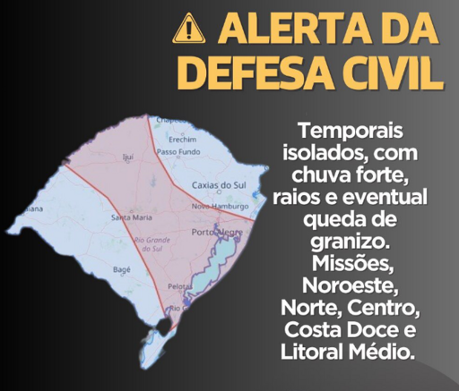 No primeiro aviso, em um mapa colorido nas cores de amarelo e laranja, Santa Maria está classificada em zona de "alerta" para temporais isolados. De acordo com o texto, os acumulados podem variar entre 40mm a 80mm no Sul, Campanha, Oeste, Centro, Costa Doce, Nordeste, Norte, Litoral Sul e Médio. Nestas regiões, pode ocorrer chuva moderada a forte acompanhada de descargas elétricas, além de rajadas de vento. Confira na imagem: