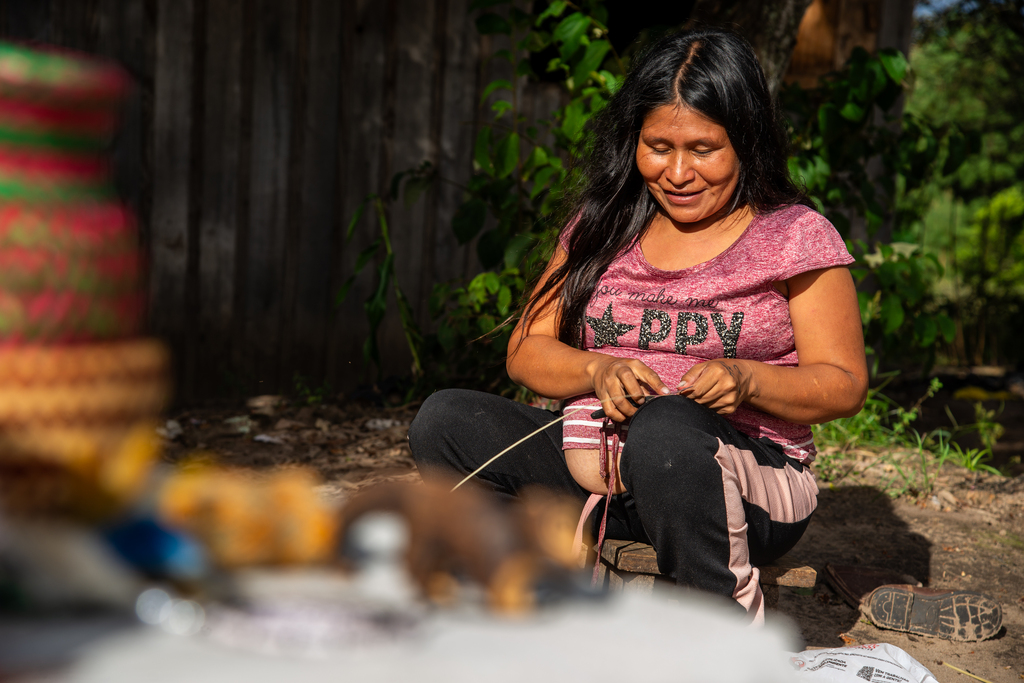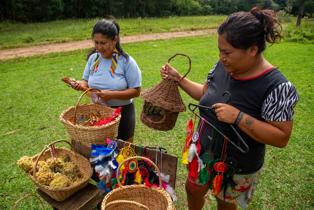 A principal fonte de renda das famílias é o artesanato. Claudinéia Medeiros, 27 anos, aprendeu o ofício manual com a mãe e a avó. Agora, já ensina o filho mais velho a trançar e dar forma aos filtros dos sonhos, pulseiras e cestinhos. Ela conta que divide a rotina entre a venda do artesanato no centro da cidade e o cuidado dos quatro filhos.