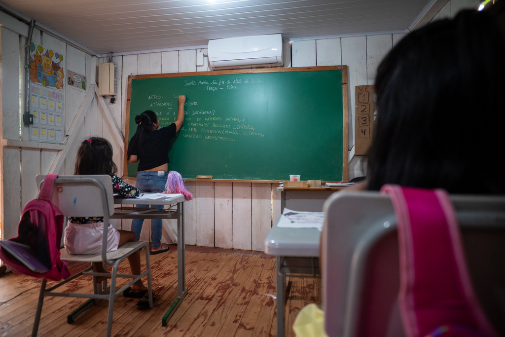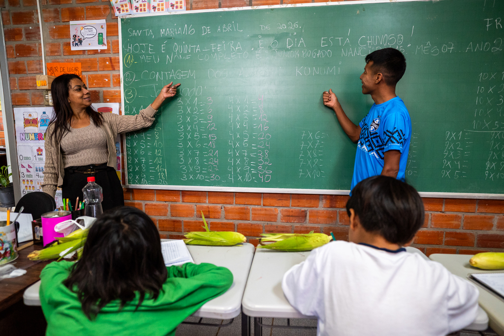 Lá, o princípio se materializa no ensino que une saberes tradicionais e conteúdos formais. Em uma das salas, um professor indígena e uma professora não indígena conduzem uma aula de multiplicação em português e guarani. Em outra, a estudante Débora Garai Fernandes, 21 anos, aplica a técnica de grafismo em um porongo, que, aos poucos, toma a forma de uma garça.