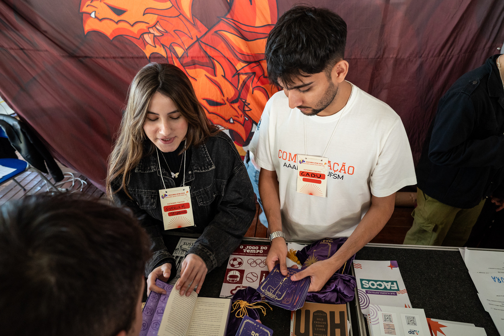 Nos estandes, muita gente interessada em novas possibilidades. Quem ficou com a missão de mostrar o curso é Isabela Matos, 21 anos, que veio de São Paulo para estudar Produção Editorial na UFSM e, em seu último ano de faculdade, reservou o dia para mostrar um pouco do conhecimento que adquiriu ao longo da graduação.