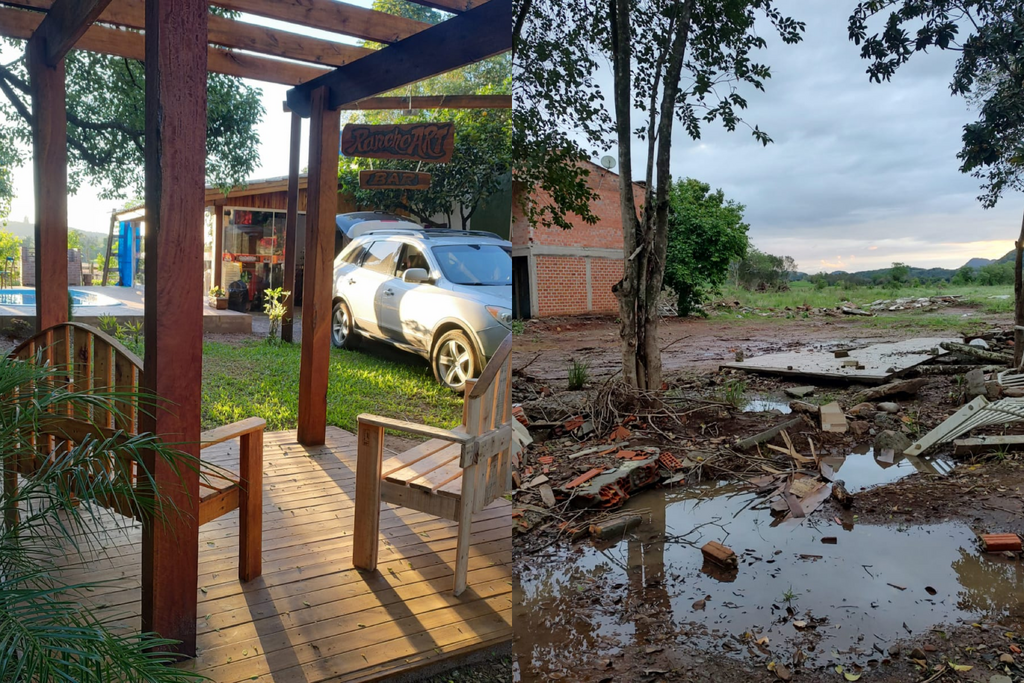 Fotos fornecidas à reportagem mostram o antes e depois da enchente que deixou o balneário irreconhecível. A casa e o Pub em que Alessandro Nascimento, presidente da associação do balneário, havia construído antes da enchente, foram levados pela força das águas. Veja o antes e depois: