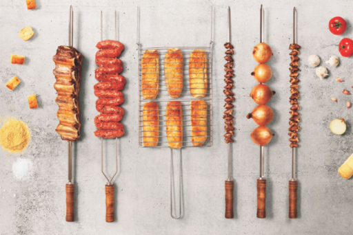 O kit é composto por seis peças: dois espetos simples, dois espetos para coração de frango, um espeto duplo, cada um com 79 centímetros de comprimento, e uma grelha, com 25,5cm x 79cm.