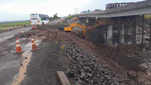 Equipes do DNIT trabalham no local para a limpeza de entulhos da obra. Durante a movimentação das máquinas o fluxo opera em sistema de PARE/SIGA.