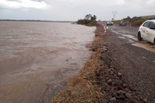 Equipes do Departamento Nacional de Infraestrutura de Transportes (Dnit) monitoram a elevação do nível da água no desvio construído sobre a várzea do Rio Toropi, na BR-287, em São Vicente do Sul. Na manhã desta sexta-feira (21), o trânsito permaneceu liberado no local, apesar de a água estar próxima da estrada.