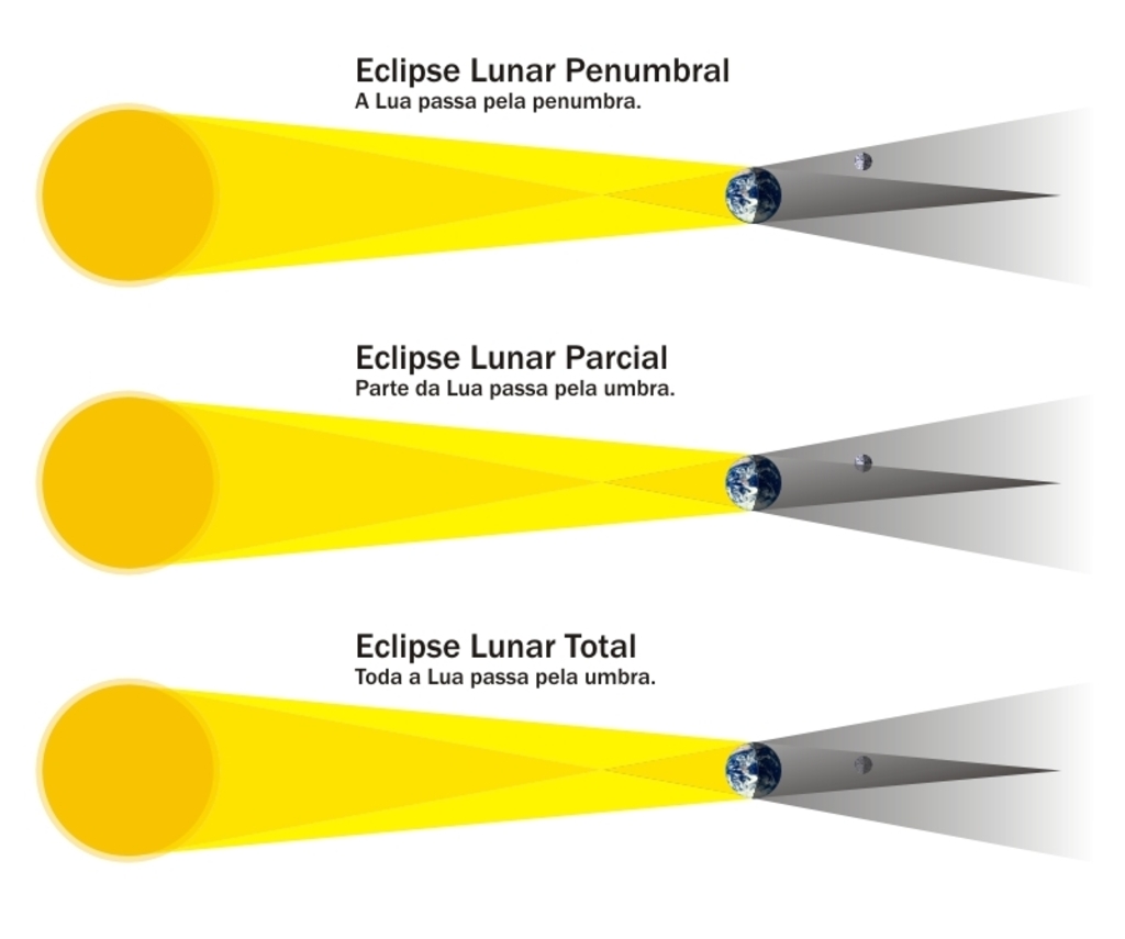 - Eclipse lunar total: é registrado quando o disco da Lua é totalmente encoberto pela sombra da Terra, com a parte mais escura da sombra terrestre, a umbra, cobrindo completamente a Lua
