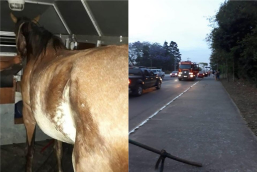 Égua foi transportada de reboque (à esquerda) do local do acidente (à direita) até a localidade de Picadinha