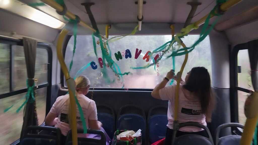A festa do dia foi para adiantar os festejos carnavalescos. Por isso, o fundo do ônibus, onde a turma se reúne, estava decorado com máscaras, faixas e os integrantes devidamente caracterizados.