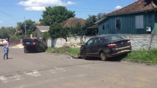 Já por volta das 15h, um Focus e um Siena acabaram se envolvendo em uma colisão na Vila Caramelo, no Bairro Juscelino Kubitschek. Segundo um morador da região, que preferiu não ser identificado, o Siena teria avançado na via, na Rua Padre Luís, e, com isso, colidiu no Focus, que seguia pela Rua Antônio Sangoi Neto. O Focus acabou sendo projetado contra o muro de uma residência, que foi derrubado, e, em seguida, tombou.