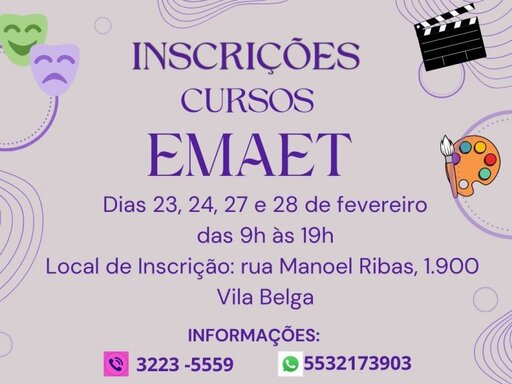 A Escola Municipal de Artes Eduardo Trevisan (Emaet) está com inscrições abertas para os cursos de artes para o ano de 2023. As aulas ocorrem nos três turnos, de segunda a sexta-feira. São ofertados cursos nas áreas de artes visuais, música e teatro para todas as idades. As inscrições são gratuitas, assim como as aulas, e devem ser realizadas presencialmente nos dias 23, 24, 27 e 28 de fevereiro na sede da escola na, na Rua Manoel Ribas, 1.900, na Vila Belga. Confira aqui a grade de horários das aulas.