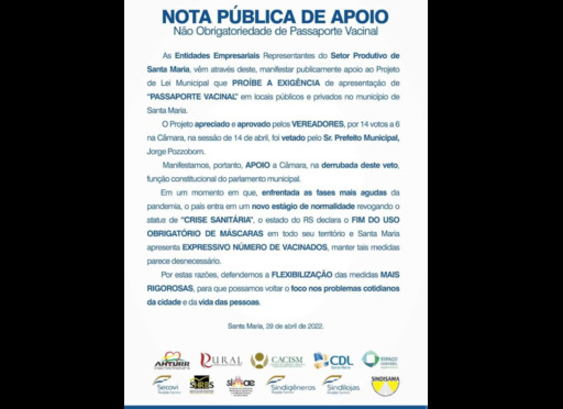 Um grupo de entidades empresariais de Santa Maria divulgou, neste fim de semana, uma nota de apoio ao projeto lei que proíbe a exigência do passaporte vacinal em locais públicos e privados da cidade. A proposta foi aprovada em abril pela Câmara de Vereadores por 14 votos a seis. Contudo, o prefeito Jorge Pozzobom (PSDB) vetou o projeto.