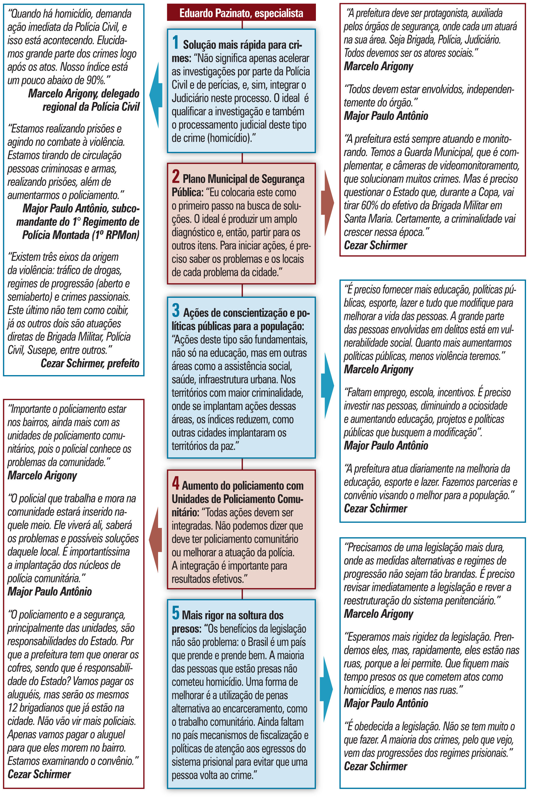 O Diário ouviu autoridades sobre sugestões feitas pelo especialista. Confira abaixo o que dizem Pazinato e outros envolvidos com o tema. A reportagem tentou contato com o deputado estadual Valdeci Oliveira, que, na segunda-feira, reuniu-se com representantes da Brigada Militar, do Batalhão de Operações Especiais e da Polícia Civil para discutir a segurança na cidade, mas, até o fechamento desta edição, ele estava em reuniões.