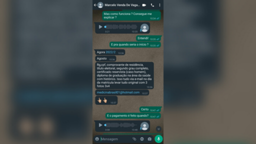 Conquistar uma vaga para Medicina em uma universidade pública, o curso mais concorrido historicamente nos processos seletivos, pode levar anos de esforços, estudos e sacrifícios. Mas se o candidato não ficar atento e se deixar seduzir por ofertas de supostas assessorias aos estudantes na internet, pode custar muito mais caro do que imagina. Nesta semana, foi descoberto um golpe de vendas de falsas vagas utilizando o nome da Universidade Federal de Santa Maria (UFSM). Pelo esquema, o candidato ingressaria supostamente na instituição por editais, mediante pagamento, quando na verdade se tratava de um estelionato.A denúncia foi divulgada em reportagem de ontem do Jornal do Almoço, na RBS TV. A vítima, uma fisioterapeuta de Pelotas, que não quer se identificar, denunciou o esquema após procurar uma empresa de assessoria de editais para tentar ingressar no curso de Medicina de uma universidade pública no Rio Grande do Sul como portadora de diploma. Em um primeiro momento, ela chegou a acreditar que a oferta da empresa era real. Uma pessoa, que se identificava como Marcelo, entrou em contato com a fisioterapeuta por WhatsApp dizendo haver uma vaga disponível na Medicina da UFSM. Ele afirmava, inclusive, que havia apenas uma vaga e que era preciso correr com a documentação para garantir o ingresso na instituição. Para garantir a vaga, o homem pedia R$ 35 mil.– O valor da vaga é R$ 35 mil. Você vai dar uma entrada e, o restante, após. Vamos supor que a entrada seja R$ 10 mil, aí você paga R$ 25 mil após. Se for R$ 5 mil, você dá R$ 30 mil após. Mas vou ver com eles lá (supostamente na UFSM). Se você quiser, eu vejo com eles qual o valor mínimo que consigo de entrada – diz o golpista em mensagem por WhatsApp.