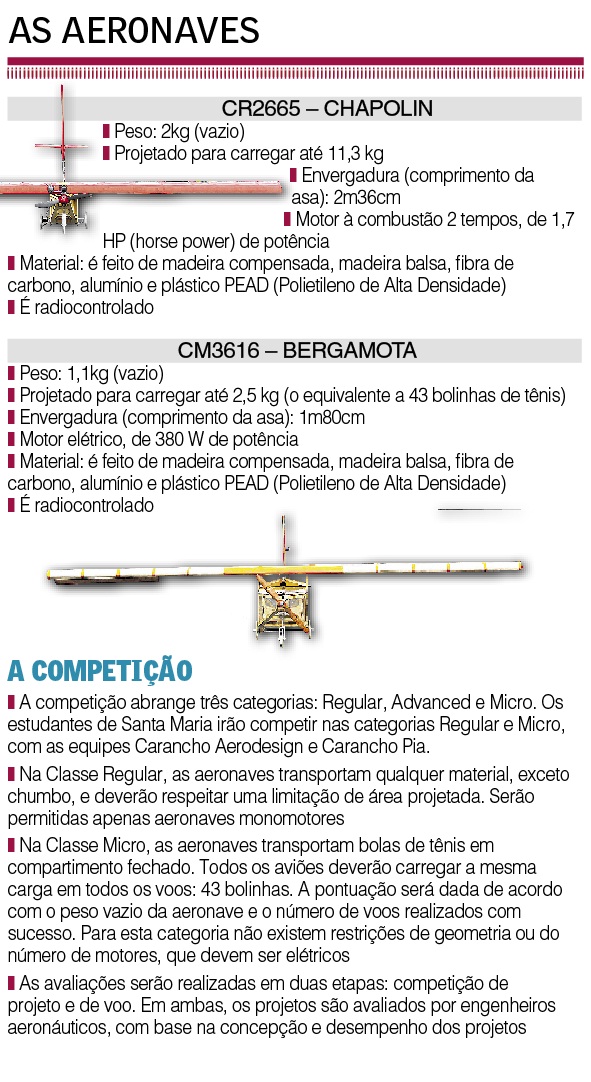Foram sete meses de preparação para o SAE Brasil AeroDesign, que terá 95 aviões projetados e construídos por estudantes de Engenharia de todo o Brasil e também do Exterior. A ideia, segundo os participantes, é ter contato com o conhecimento em aeronáutica e adquirir experiência profissional na área. As equipes de Santa Maria, formadas por alunos das engenharias Civil, de Computação, de Controle e Automação, Elétrica, Mecânica e Química, apostam na integração como diferencial.
