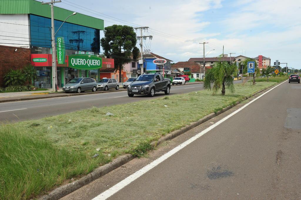 Em um trecho da Faixa Velha, a grama está aparada (foto). Na segunda-feira, os comerciantes Lia Borin Noal e Luiz Fernando Noal limparam o local. Antes, o aposentado Rubens de Almeida limpava.