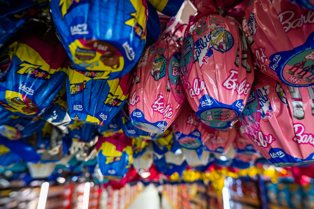 Entre os produtos voltados ao público infantil, os ovos com brinquedo continuam chamando atenção. Os modelos da Barbie e da Hot Wheels, ambos com 166 gramas, custam R$ 89,90. Já a opção da Trakinas, que pesa 190g, vem com brinquedo e sai por R$ 69,90.