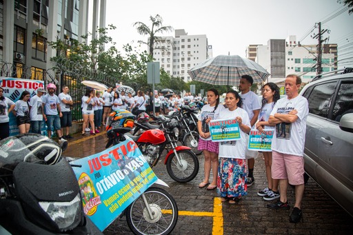 Nem a chuva forte que caiu em Santa Maria na tarde desta sexta-feira (22) impediu que amigos e familiares do jovem casal Otávio Henrique Carneiro da Silva, 21 anos, e Yasmim Pacheco Soares, 20, mortos em um acidente no último sábado (16) na BR-158, realizassem um protesto pedindo por justiça. Eles questionam a soltura, na segunda (18), do motorista bêbado que atingiu a motocicleta do casal entre o Trevo dos Quartéis e o acesso ao Bairro Tancredo Neves.