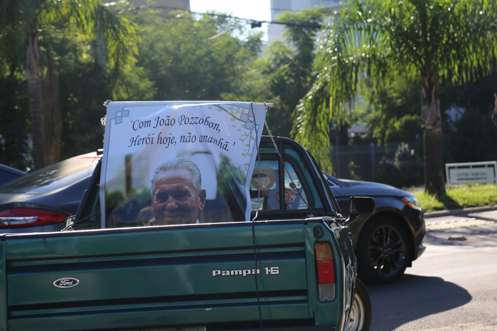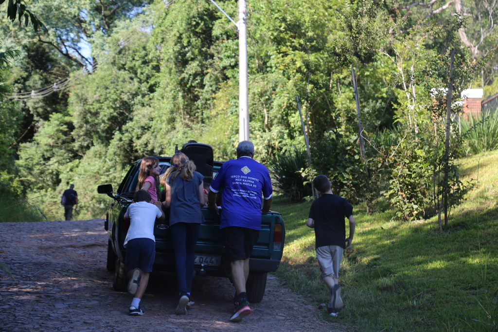 No veículo, um banner exibia a imagem do Diácono com a frase: “Com João Pozzobon, Herói hoje, não amanhã!”. Mais do que um suporte de som, a Pampa tornou-se um refúgio: em um trecho íngreme e cansativo, as crianças menores foram colocadas na caçamba do carro para serem poupadas do esforço físico, enquanto adultos e crianças mais velhas se uniram para ajudar a empurrar a Pampa para que ela vencesse a ladeira.