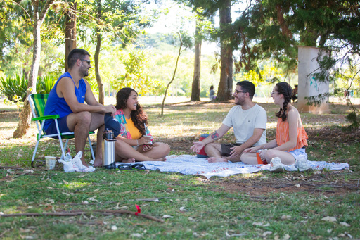 Para fugir do calor, a saída foi procurar por uma sombra. Foi o caso do grupo composto por Igor Rodrigues, 28 anos, Thays Waltermann, 25, Matheus Buenevides, 27 e Letícia de 24. Eles foram até o campus da Universidade Federal de Santa Maria (UFSM) para curtir o dia ensolarado. O bosque, embaixo das árvores, foi o local escolhido para desfrutar um chimarrão e colocar a conversa em dia.