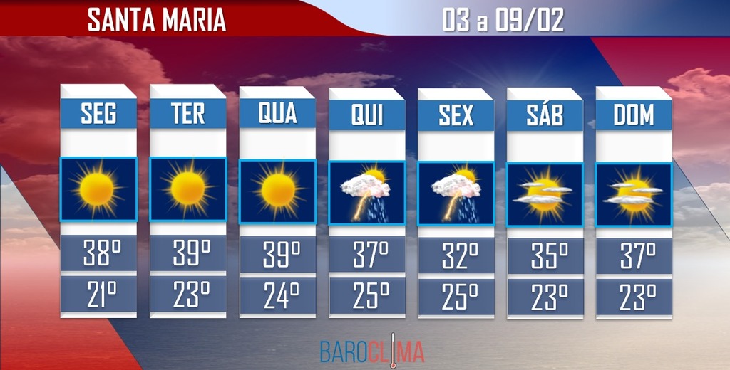 A previsão é que a onda de calor siga nesta segunda-feira (3), quando o dia inicia com 21°C e a máxima pode chegar a 38°C. Na terça (4) e quarta (5), as máximas podem chegar aos 40°C em Santa Maria e região. Verardo prevê que podem ser os dias mais quentes do ano, com desconforto térmico na casa dos 45°C.