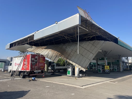 Um posto de combustíveis localizado na Faixa Velha de Camobi, em Santa Maria, teve o forro arrancado pela força do vento norte na manhã desta sexta-feira (14). A estrutura não resistiu às fortes rajadas de 72 km/h e caiu por volta das 8h. Segundo proprietários, das seis bombas, nenhuma foi afetada. Apesar do transtorno, o estabelecimento opera normalmente.