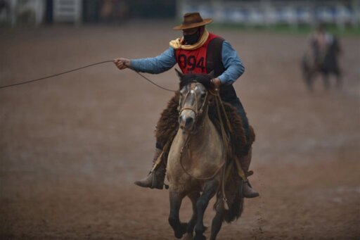 Com arquibancadas vazias, os competidores realizaram as provas de tiro de laço abaixo de chuva e com a torcida vibrando de casa.