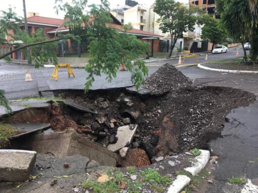 Atenção, motoristas! O trânsito na Avenida Borges de Medeiros, esquina com a Rua Estácio Lemos, está bloqueado. No local, uma cratera abriu após uma galeria pluvial ceder no final da tarde desta quinta-feira por conta da forte chuva que atinge Santa Maria.
