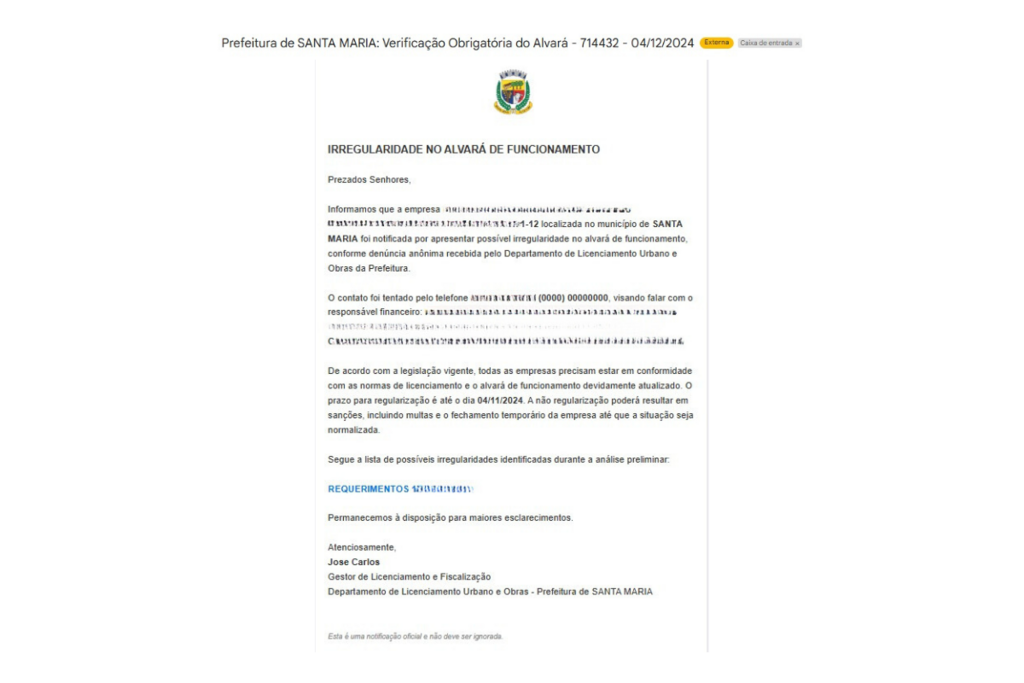 Empresas de Santa Maria podem estar sendo vítimas de um golpe envolvendo o recebimento de e-mails falsos sobre irregularidades em alvarás de localização. A prática consiste no envio de um documento para a empresa, informando que essa "foi notificada por apresentar possível irregularidade no alvará de funcionamento, conforme denúncia anônima recebida pelo Departamento de Licenciamento Urbano e Obras da Prefeitura".