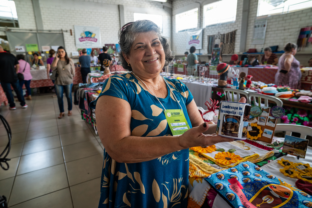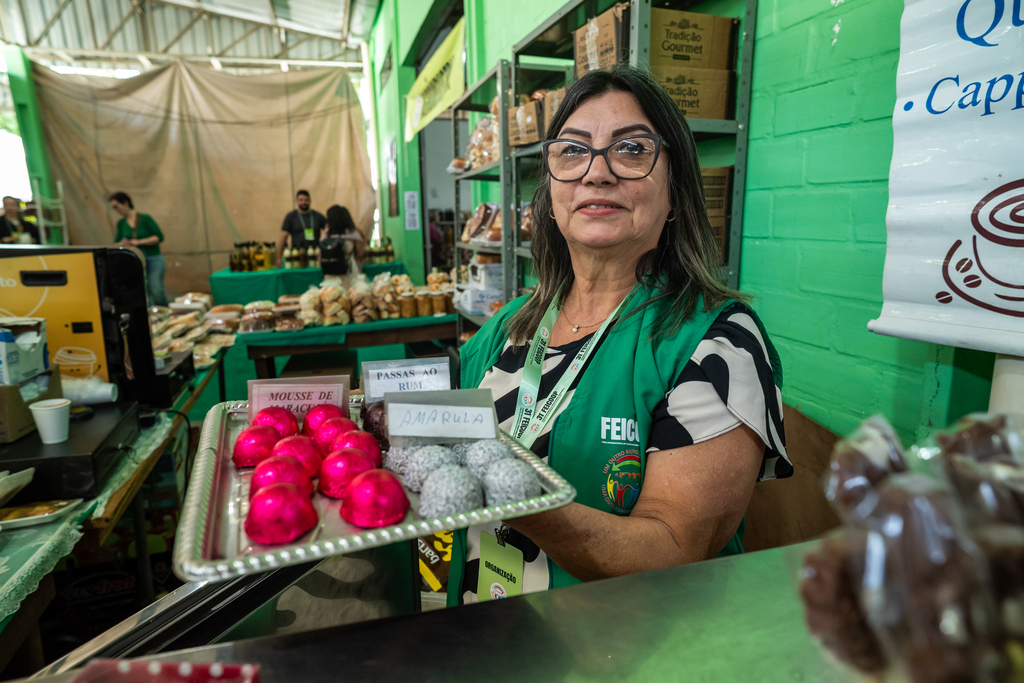 Entre os corredores do Centro de Referência, histórias como a da feirante Marli Dambrósio se misturam ao aroma de doces e salgados. Há cerca de 20 anos, ela trabalha com economia solidária, comercializando seus produtos nos pavilhões da Feicoop.