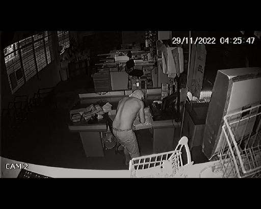 No vídeo é possível ver o homem com a camiseta enrolada no rosto vasculhando as gavetas dos caixas em busca de dinheiro. Na sequência, o alarme teria disparado, momento em que o suspeito coloca alguns maços de cigarro no bolso e foge do local.