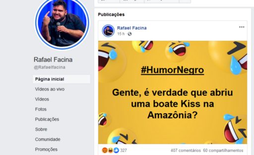 O comediante Rafael Facina postou, no começo da noite de quinta-feira, em sua página no Facebook, uma piada envolvendo a tragédia da Boate Kiss, ocorrida em janeiro de 2013, e a situação das queimadas na Floresta Amazônica: "#Humor Negro. Gente, é verdade que abriu uma boate Kiss na Amazônia?", é o que diz a postagem, feita no perfil oficial do humorista, que conta com pouco mais de 7 mil curtidas.