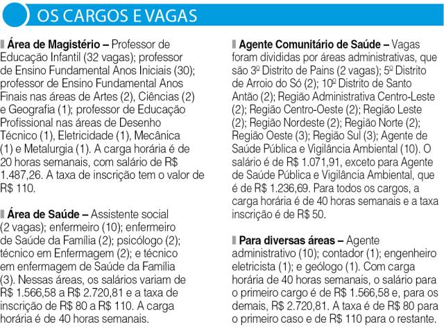 Nos quatro editais já publicados, estão previstas 137 vagas, para cargos no Magistério, Saúde, Agentes Comunitários de Saúde, entre outras áreas. Para conferir os editais dos concursos clique aqui.