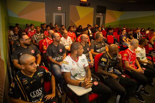 Por fim, a comissão técnica do Alvirrubro e os jogadores foram chamados um a um e entraram no Auditório do Diário. Todos eles vestindo os novos uniformes do Inter-SM já com os patrocinadores atualizados.