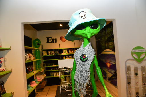 Personagem durante a programação especial do Museu Internacional de Ufologia, História e Ciência de Itaara, em 2022, no chamado “mês do Alien Louco”.