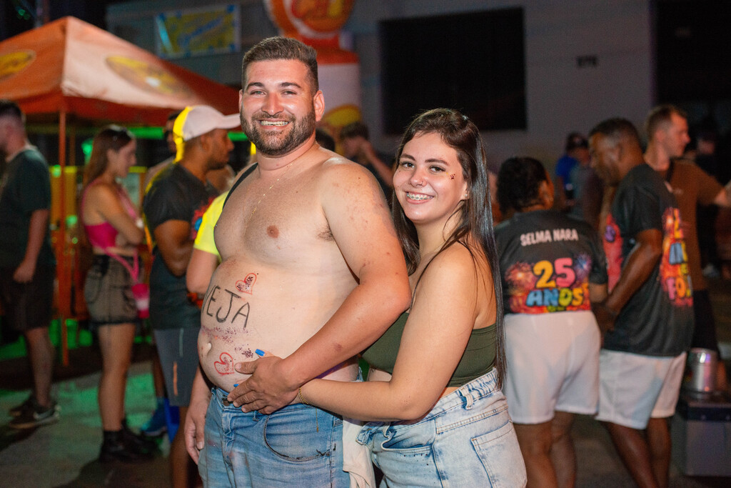 Mas nem só em bloquinho os foliões se divertem, entre casal e futuro filho, a folia também está garantida. De Santa Maria, a auxiliar administrativa Flaviane Sichomany, 20 anos, grávida de quatro meses, utilizou escritas corporais que remetem a um chá revelação. O fato inusitado, no entanto, ficou para o marido, o vendedor Guilherme Dávila, 26, que, com bom humor, escreveu a palavra "cerveja" na própria barriga em alusão do que diz ter a "famosa barriguinha de chope".