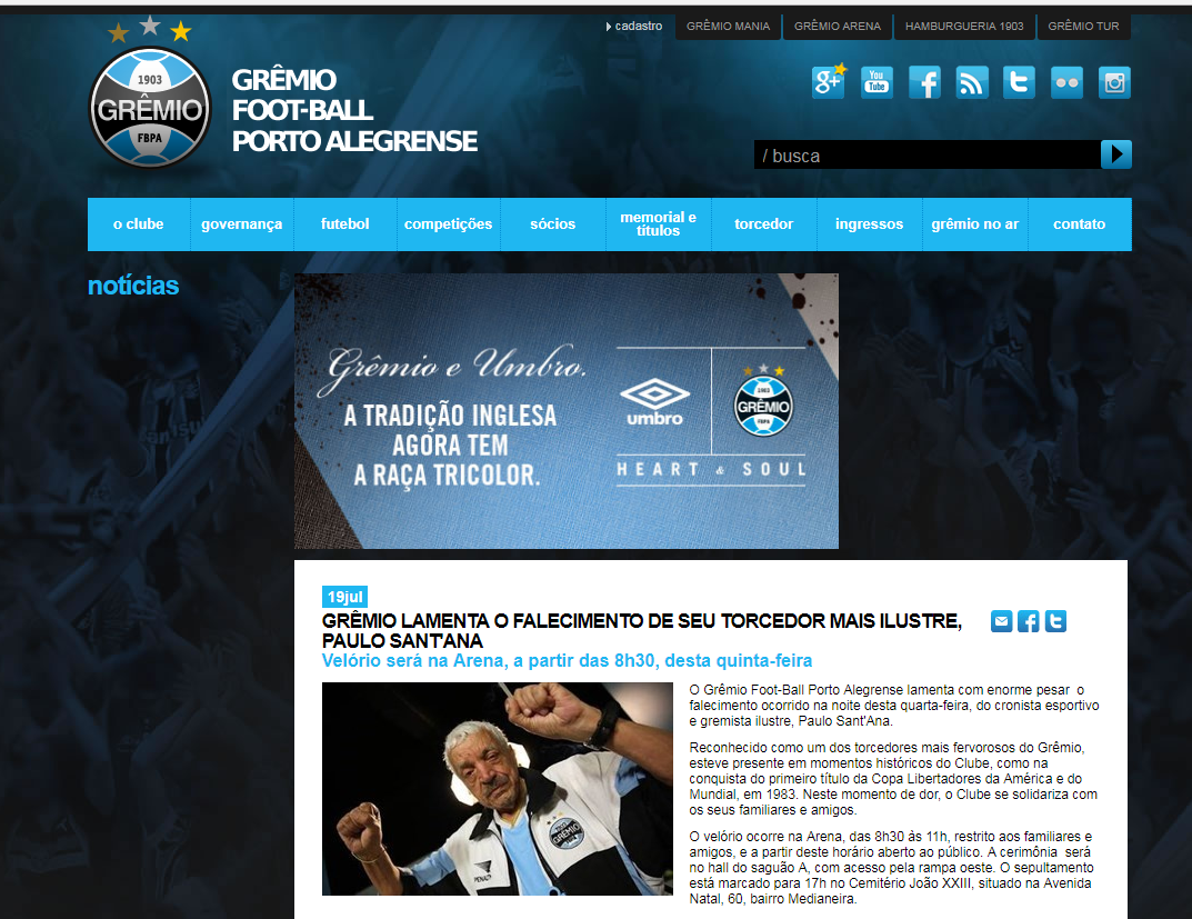 Nesta manhã, uma nota oficial publicada no site do Grêmio lamentava a morte "de seu torcedor mais ilustre":