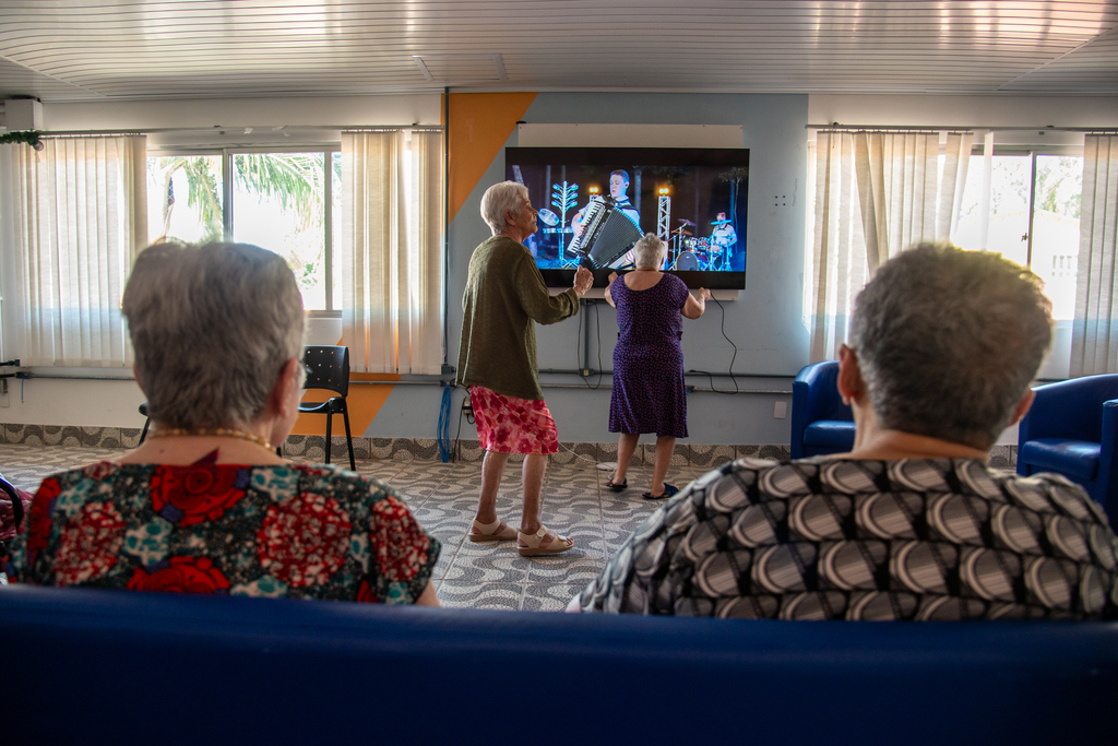 Para dar conta da rotina, a instituição funciona com uma equipe multidisciplinar de 130 profissionais, que incluem técnicos de enfermagem, enfermeiras, cuidadores, cozinheiras, lavanderia, porteiros, além de setores administrativos e técnicos. São cinco refeições diárias, cuidados contínuos e atividades que buscam garantir convivência, saúde e qualidade de vida às moradoras.