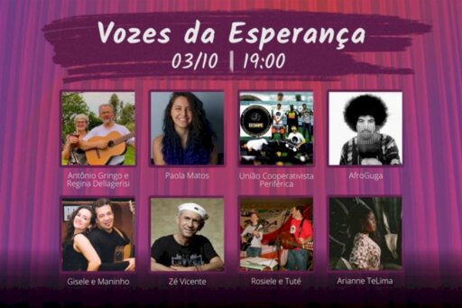 - Domingo - A partir das 19h, Show Vozes da Esperança, pelo Facebook da Feicoop, com Gisele e Maninho, Paola Matos, Arianne TeLima, União Cooperativista da Periferia, Antônio Gringo e Regina Dellagerisi, Zé Vicente, AfroGuga e mais músicos, bailarinos e atores