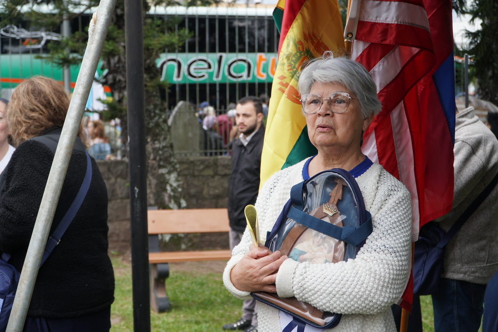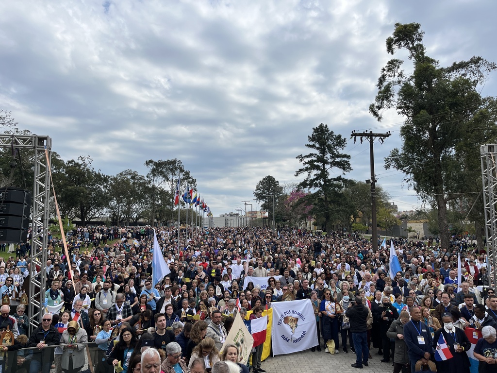 Apesar da previsão de chuva, o caminho de aproximadamente uma hora foi concluído sem uma gota de água. Em alguns momentos, alguns raios de sol apareceram em meio ao céu nublado, iluminando os fiéis que carregavam a imagem da Mãe e as bandeiras dos países representados no encontro.