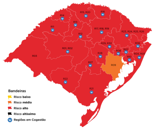 O mapa definitivo do Distanciamento Controlado segue o mesmo divulgado preliminarmente na última sexta-feira. Das 21 regiões, 20 estão em bandeira vermelha (risco alto de contágio do coronavírus). Apenas a região de Guaíba recebeu a classificação de risco médio e ficou em bandeira laranja.